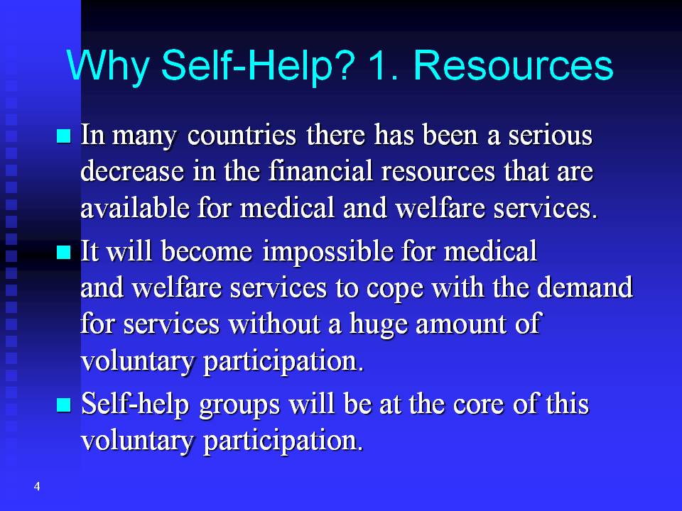 First, in many countries there has been a serious decrease in the financial resources that are available for medical and welfare services. This is particularly the case in countries like Japan that have a rapidly ageing population. As the population ages, we will need more and more services to meet the needs of the increasing numbers of old people. Soon it will become impossible for medical and welfare services to cope with the demand for services without a huge amount of voluntary participation. Self-help groups will be at the core of this voluntary participation.