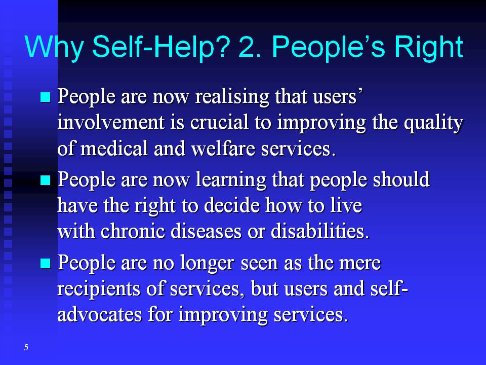 The second reason for the new interest in self-help groups is people are now realising that users' involvement is crucial to improving the quality of medical and welfare services.
