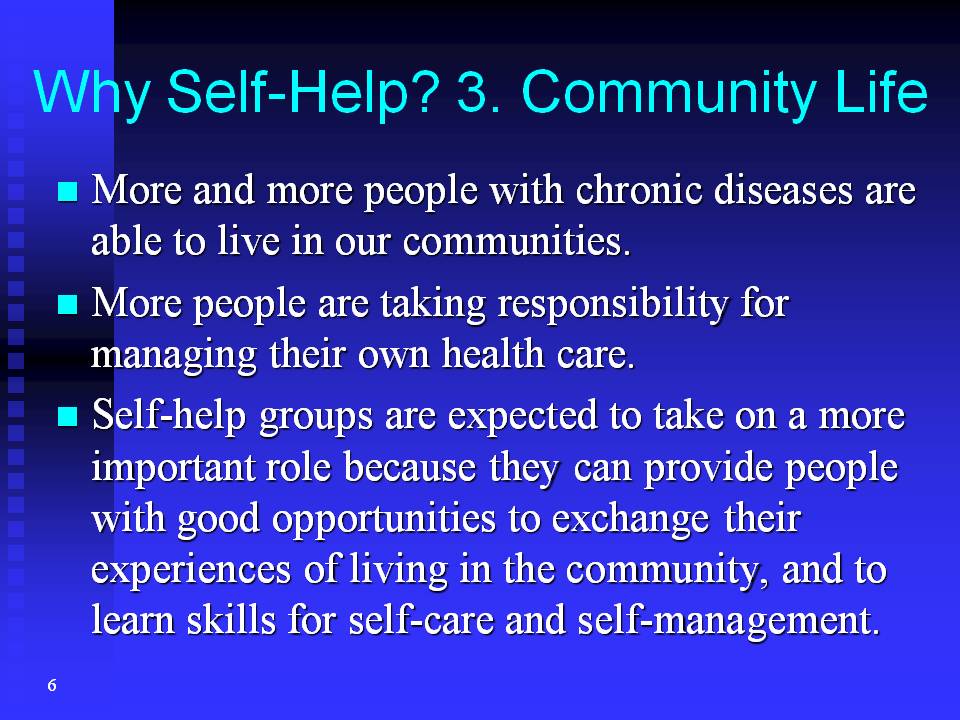 The third reason is, more and more people with chronic diseases are able to live in our communities rather than in institutions. This means that more people are taking responsibility for managing their own health care. Self-help groups are now expected to take on a more important role because they can provide people with good opportunities to exchange their experiences of living in the community, and to learn skills for self-care and self-management.