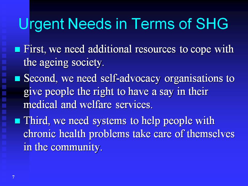 First, we need additional resources to cope with the ageing society. Second, we need self-advocacy organisations to give people the right to have a say in their medical and welfare services. Third, we need systems to help people with chronic health problems take care of themselves in the community. Of course, these three needs are catered for, not only by self help groups, but also by support groups, which is probably why many professionals confuse self-help groups and support groups. So we will go on to the next question: What is the difference between self-help groups and support groups? To find the answer to this, let's have a look at some definitions.
