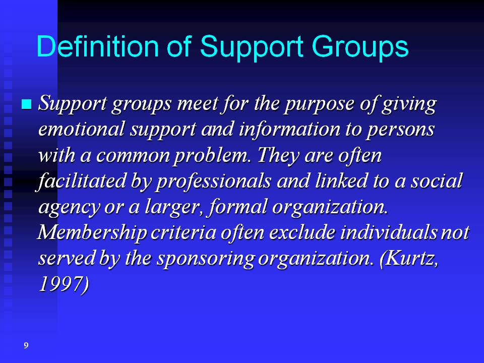 Support groups meet for the purpose of giving emotional support and information to persons with a common problem. They are often facilitated by professionals and linked to a social agency or a larger, formal organization. Membership criteria often exclude individuals not served by the sponsoring organization.