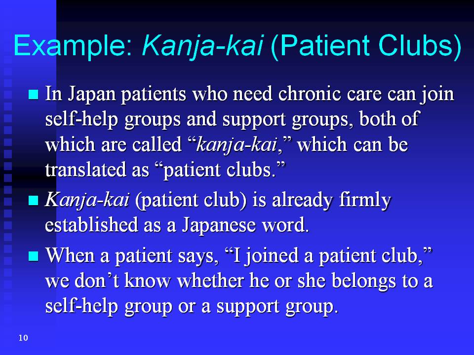 Kanja-kai (patient club) is already firmly established as a Japanese word. Actually, while I was preparing for this speech, I put kanja-kai (patient club) into Google.com as a key word, and I got over six hundred thousand pages. This shows that the concept of patient club is well established in the Japanese society. But because it has two meanings, when a patient says, "I joined a patient club," we don't know whether he or she belongs to a self-help group or a support group. Now hearing me say this, some of you might be asking yourselves, "What's wrong with that? Does it matter?""