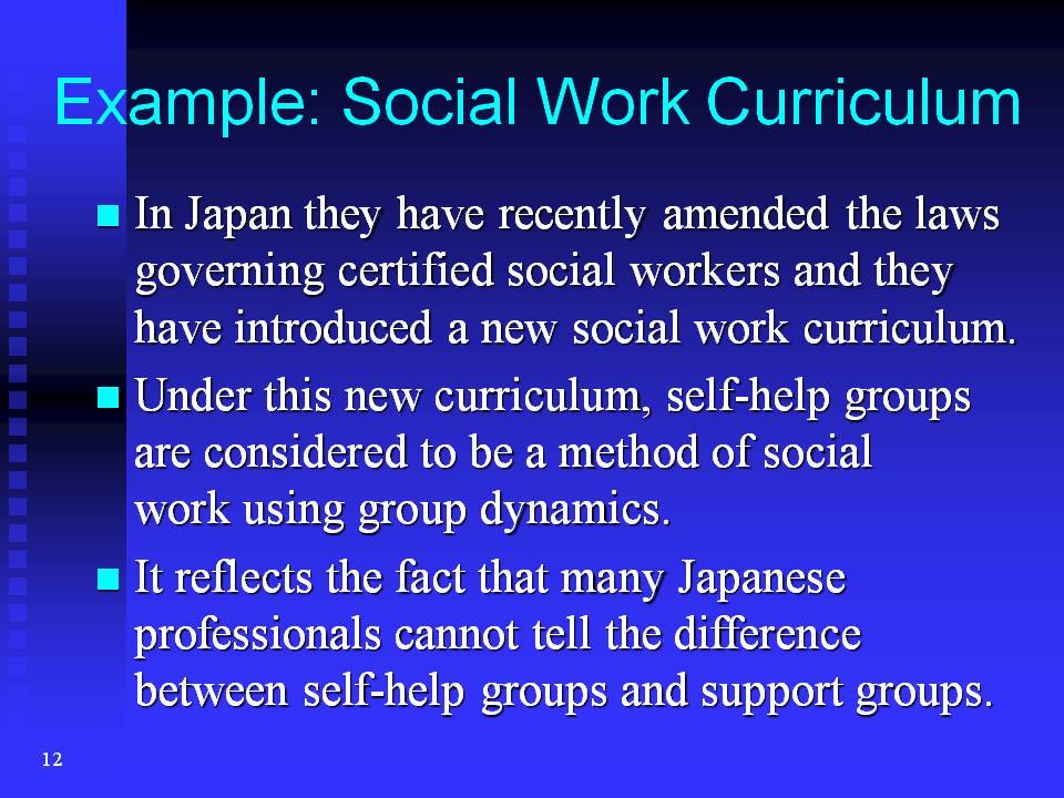 Under this new social work curriculum, self-help groups are considered to be a method of social work using group dynamics. I think this understanding of self-help groups is wrong. I think it reflects the fact that many Japanese professionals cannot tell the difference between self-help groups and support groups.