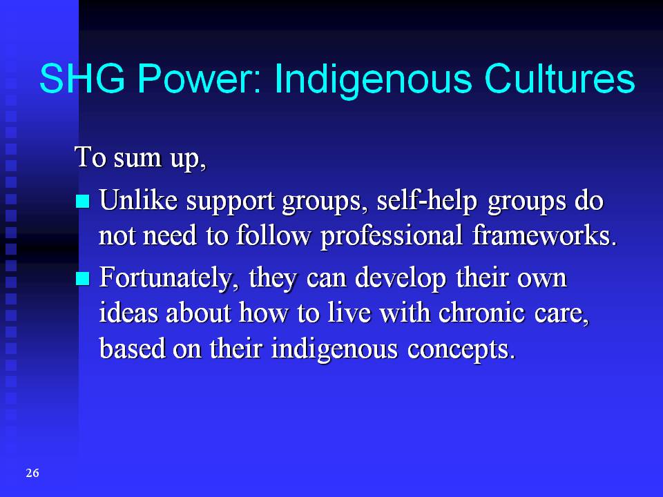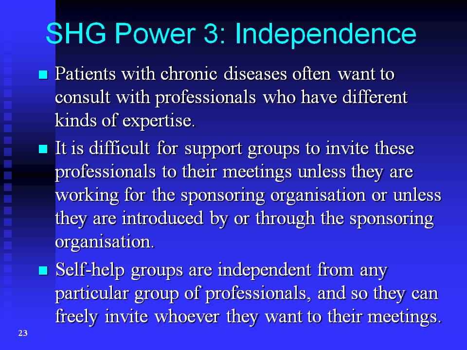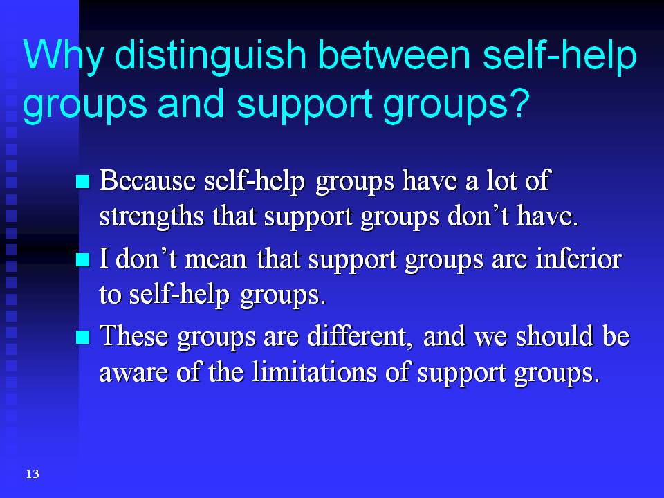 My answer is simple: Because self-help groups have a lot of strengths that support groups don't have. Please don't misunderstand me when I say that. I don't mean that support groups are inferior to self-help groups. What I want to emphasise is that these groups are different, and we should be aware of the limitations of support groups.