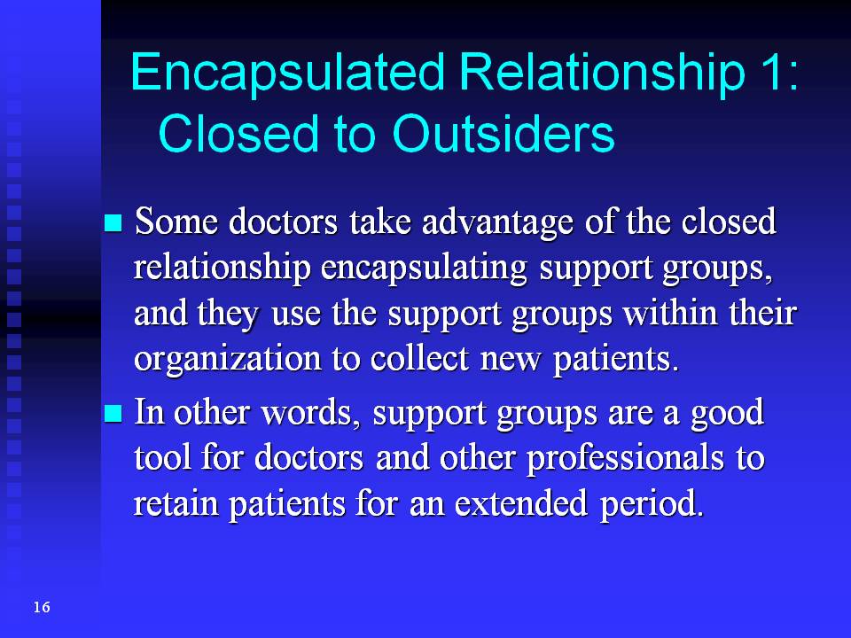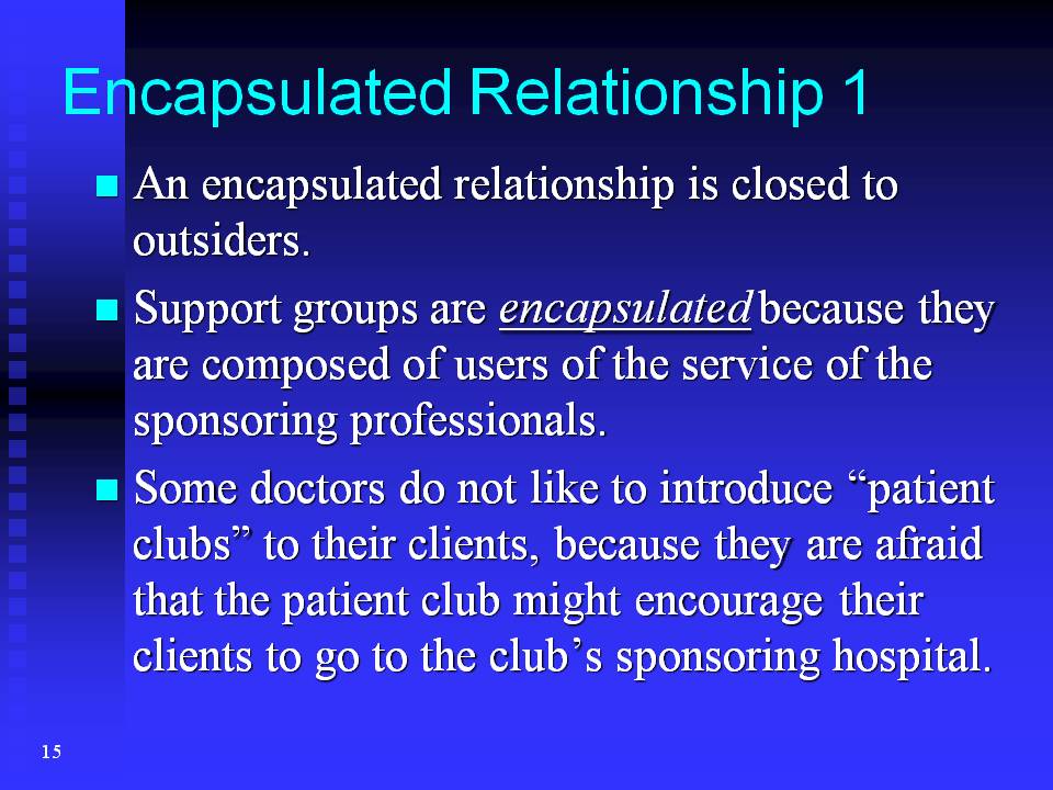 Support groups are encapsulated because they are composed of users of the service of the sponsoring professionals. So, for example, a patient who does not use a hospital, cannot join the support group sponsored by that hospital. I often heard that some doctors do not like to introduce "patient clubs" to their clients, because they are afraid that the patient club might encourage their clients to go to the club's sponsoring hospital.