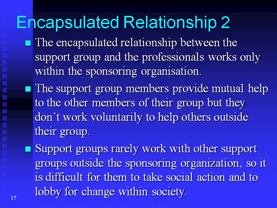 Second, the encapsulated relationship between the support group and the professionals works only within the sponsoring organisation.