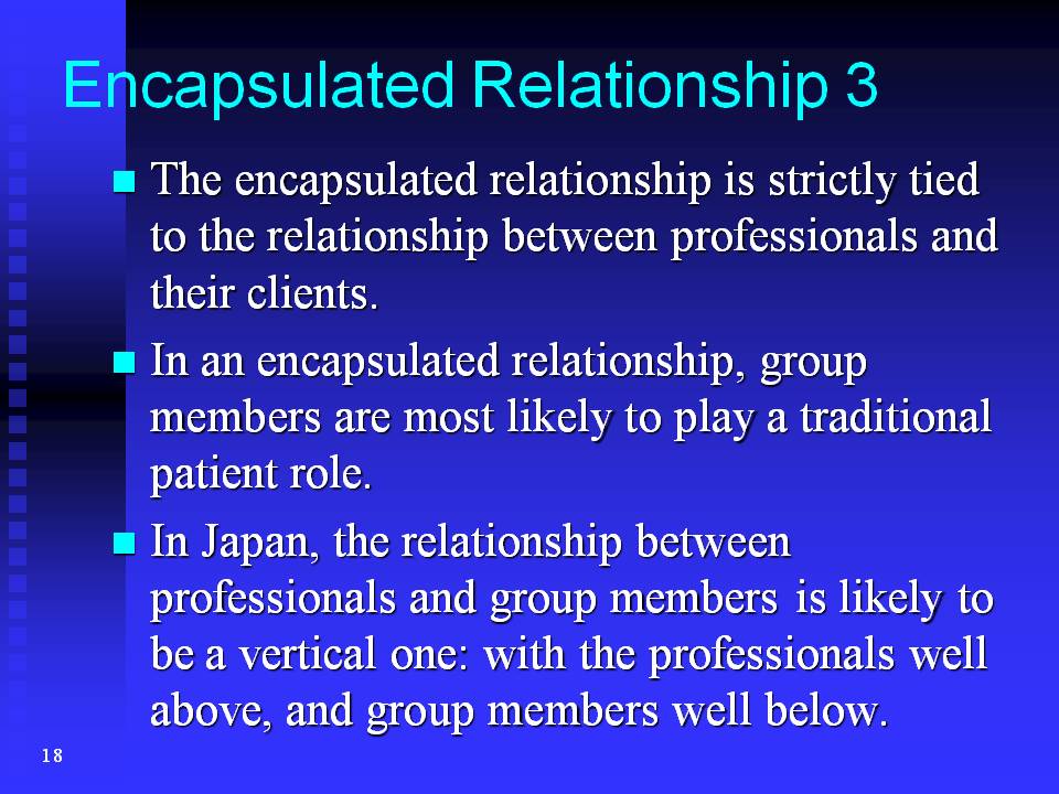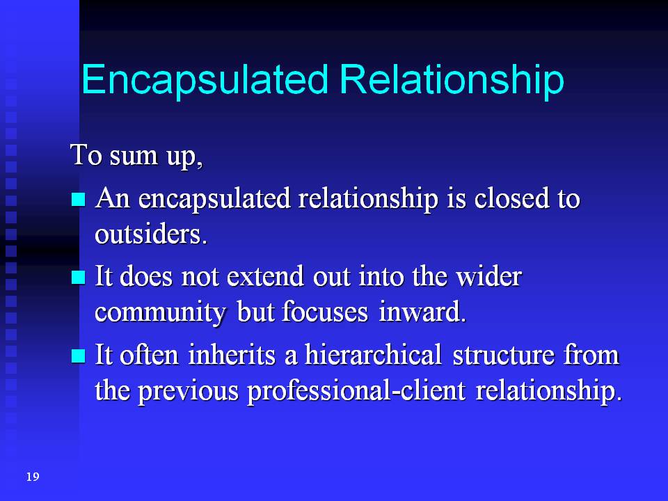 To sum up, first an encapsulated relationship is closed to outsiders; second, it does not extend out into the wider community but focuses inward, and third, it often inherits a hierarchical structure from the previous professional-client relationship.
