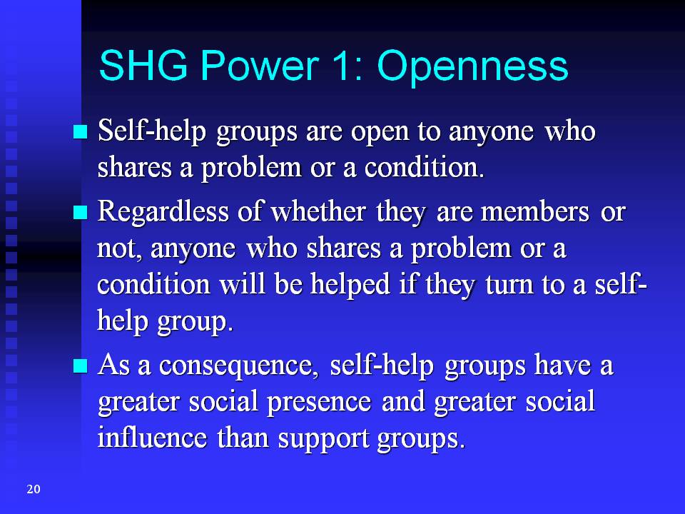 After considering these features of support groups, we can now compare them with self-help groups and better understand the power of self-help groups.