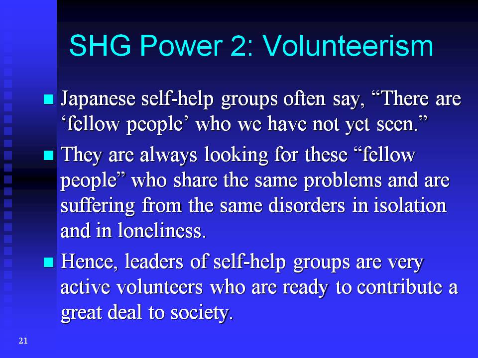 Japanese self-help groups often say, "There are 'fellow people' who we have not yet seen." They are always looking for these "fellow people" who share the same problems and are suffering from the same disorders in isolation and in loneliness. Hence, leaders of self-help groups are very active volunteers who are ready to contribute a great deal to society.