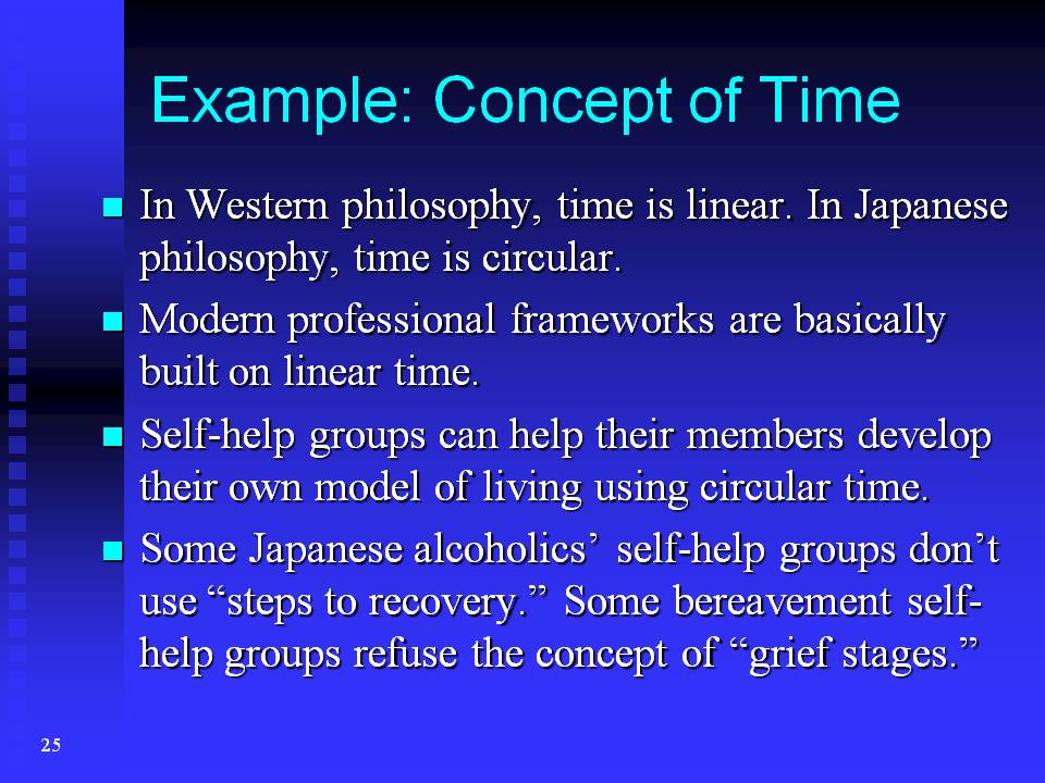 A good example of this is the concept of time. In Western philosophy, time is linear; time has a beginning and an ending. In Japanese philosophy, like many Asian philosophies, time is circular; there is no beginning and no ending of time. Modern professional frameworks are basically built on linear time. This means that professionals might show their patients a recovery model based on linear time, but many Japanese patients live within circular time. Japanese self-help groups can help their members develop their own model of living using circular time. For example, some Japanese alcoholics' self-help groups do not use "steps to recovery." Also, some Japanese bereavement self-help groups refuse the concept of "grief stages," which professionals like to apply to their clients. Both of these self-help groups function within a concept of circular time.