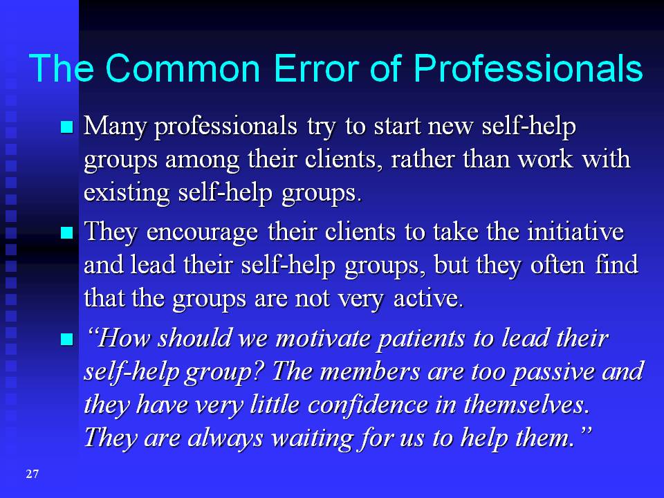 Finally I would like to tell you a little bit about the common error made by professionals who want to utilise the power of self-help groups.