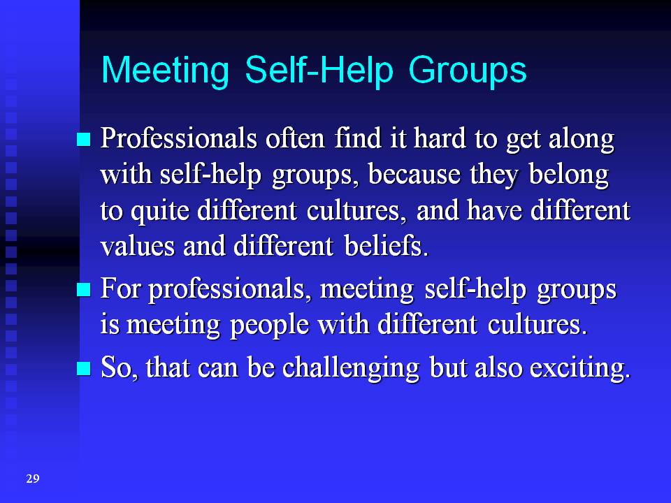 However, I know, professionals often find it hard to get along with self-help groups, because they belong to quite different cultures, and have different values and different beliefs.